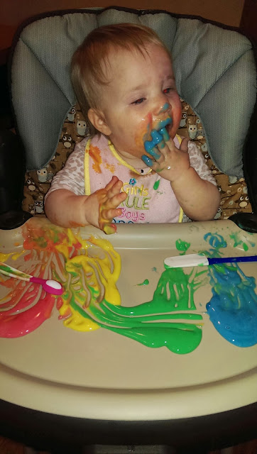 After a very short nap, she woke crying again so I decided to do some sensory play to try to make her happy. I took one individual container of vanilla yogurt and divided it evenly in 4 little glass bowls. I mixed a drop of food coloring into each bowl of yogurt then placed the yogurt onto her highchair tray and let her go to town with it. She enjoyed it even though she looks pitiful in the pictures. You can actually see her hand print over her left eye from her nap lol.